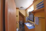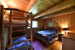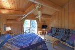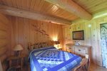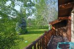 Located at Wolfridge Resort, Running Wolf Cabin is a two story log townhome. The living area has cathedral ceilings and has an open airy feel. Hardwood floors, log walls, and unique furniture make this cabin feel like a remote escape while still being close to the fun. Upstairs is a studio bedroom with its own kitchenette, bathroom, and balcony.